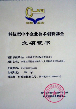 1999年 ,公司被大连市政府批准为高新技术企业并给予资金扶持。 2001年公司“高速双面抛超精密加工大面积蓝宝石单晶基片项目”获国家科技部中小企业科技创新基金扶持 。